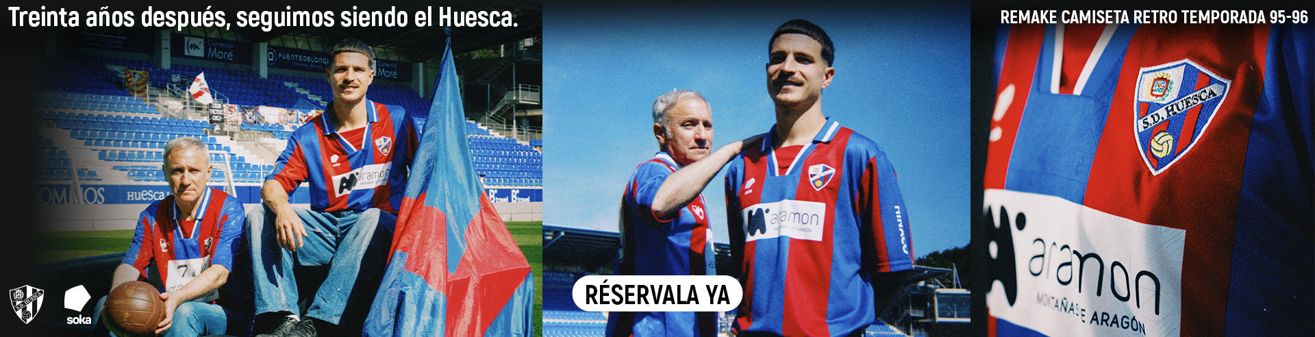 Inspirada en el escudo de Aragón, nuestra nueva primera equipación para esta temporada 25/26 rinde homenaje a nuestra identidad. Con barras grana sobre fondo azul y la bandera aragonesa en los puños, es símbolo de orgullo, historia y pasión oscense.