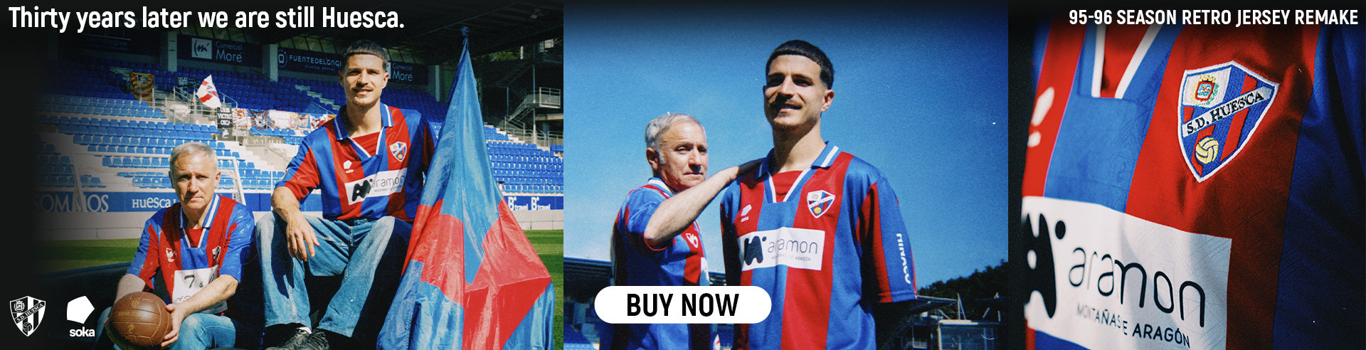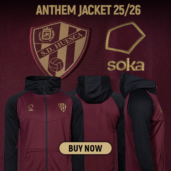 Inspirada en el escudo de Aragón, nuestra nueva primera equipación para esta temporada 25/26 rinde homenaje a nuestra identidad. Con barras grana sobre fondo azul y la bandera aragonesa en los puños, es símbolo de orgullo, historia y pasión oscense.